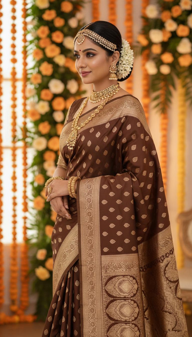 Banarasi Katan Soft Silk Saree - Zari Border and Jacquard Blouse - BANAR-008-Brown