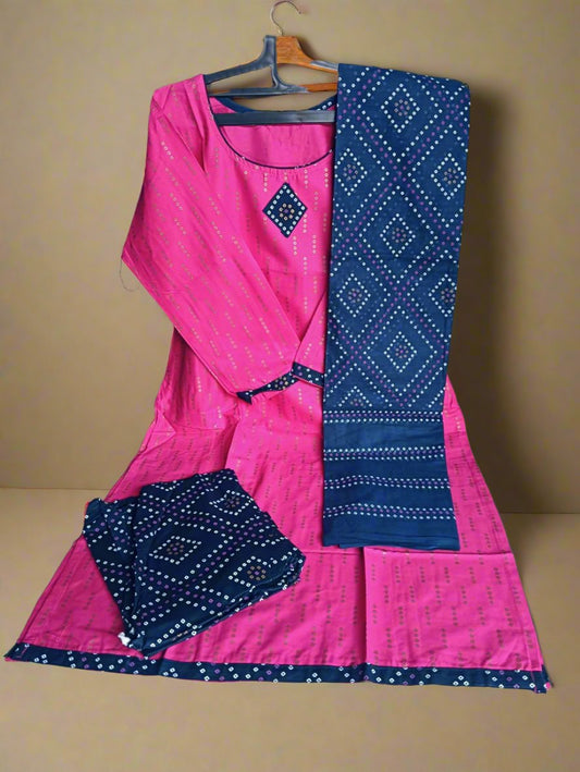 Pranjul Brand Cotton 3PC Set: Pink Top, Blue Bottom with Dupatta