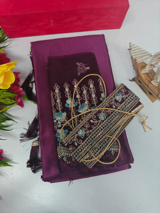 Stylish Hip Belt-Satin Saree with Embroidered Blouse-Plain Sarees