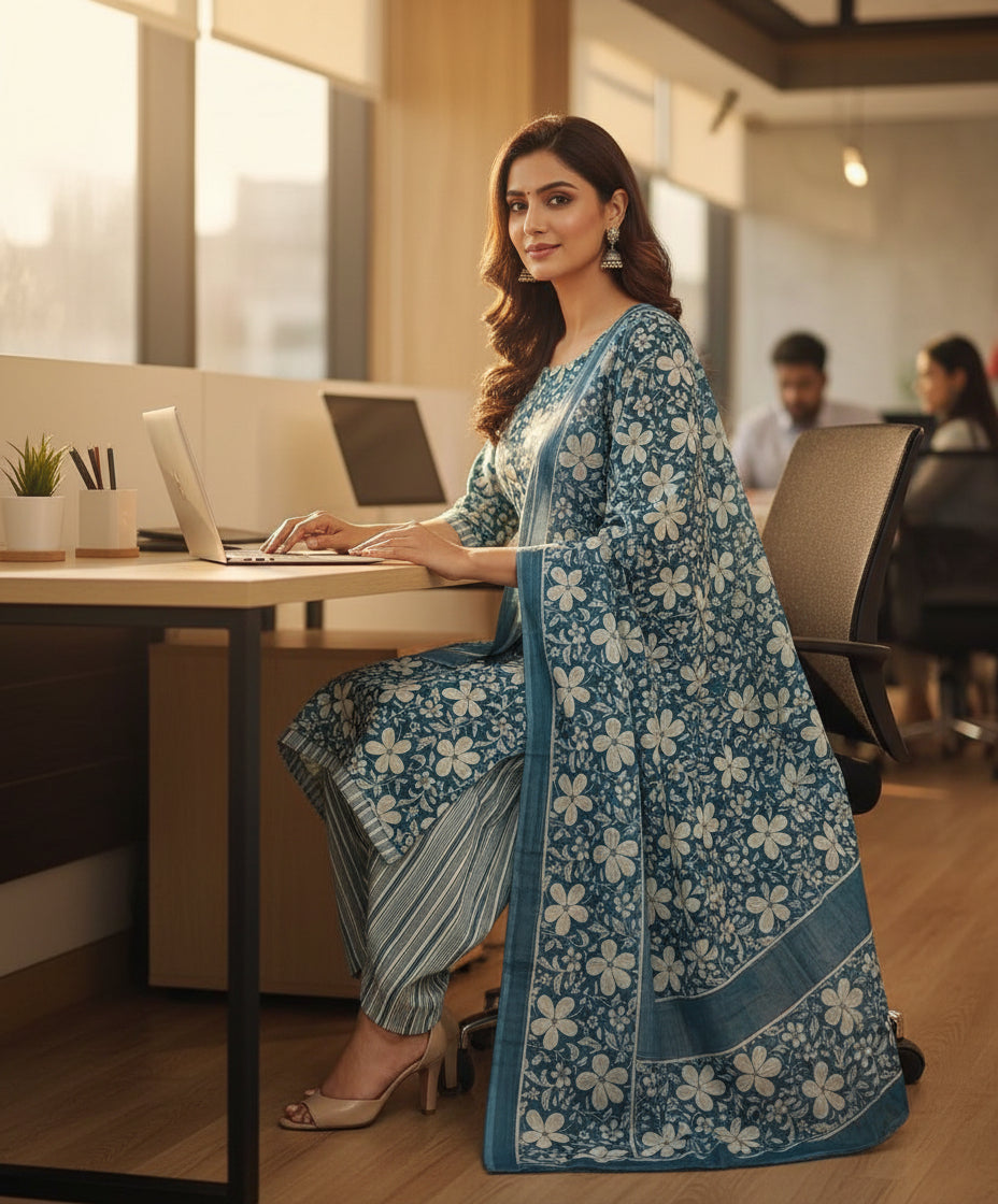 Shop Straight-cut cotton kurta pant dupatta set Ocean-Blue Floral design - 3Pc stitched readymade Floral print design with soft cotton dupatta, perfect for daily and office wear.