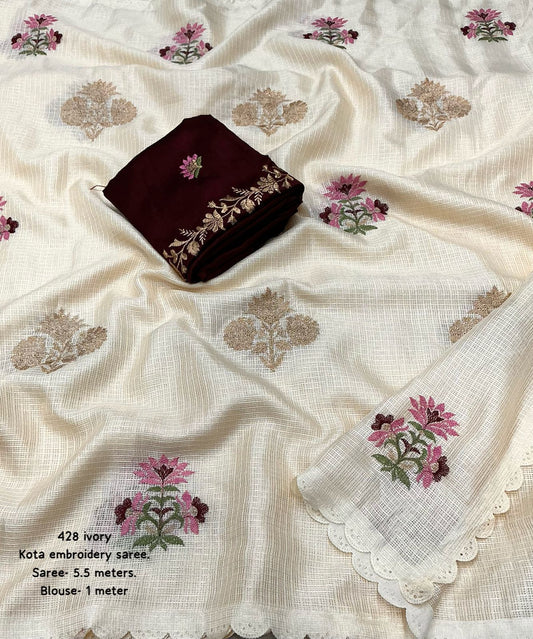 Embroidery-Ivory Kota Silk Saree-Zari Cutwork with Contrast Blouse-EMB-003